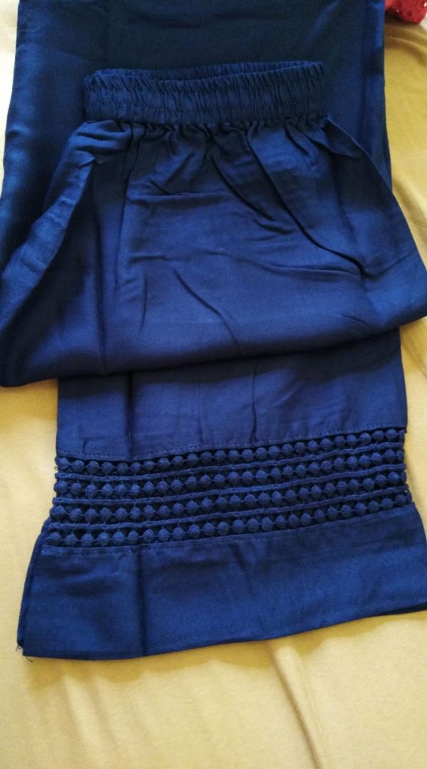 Rayon designer plazzo with lace work. Good to wear in summer with air vent your legs feel so nice. wide nice open lace work.