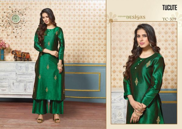 Fancy Khadi two tone silk suit with embroidery work on top/kurti with plain plazzo/bottom. It is very light weight suit to makes you comfortable and shine your style to go with. Round neck well finish, accessories with metal buttons. 3/4 sleeves makes it more attractive.
