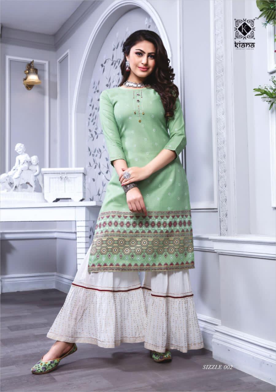 Designer outfit finish with gotta work on top and bottom. Top enhanced with hand work touches golden block print and Bottom/sharara is highlighted with block print and gotta work. Top has designer sleeves with lace work. Bottom/Sharara has gotta and lace work.